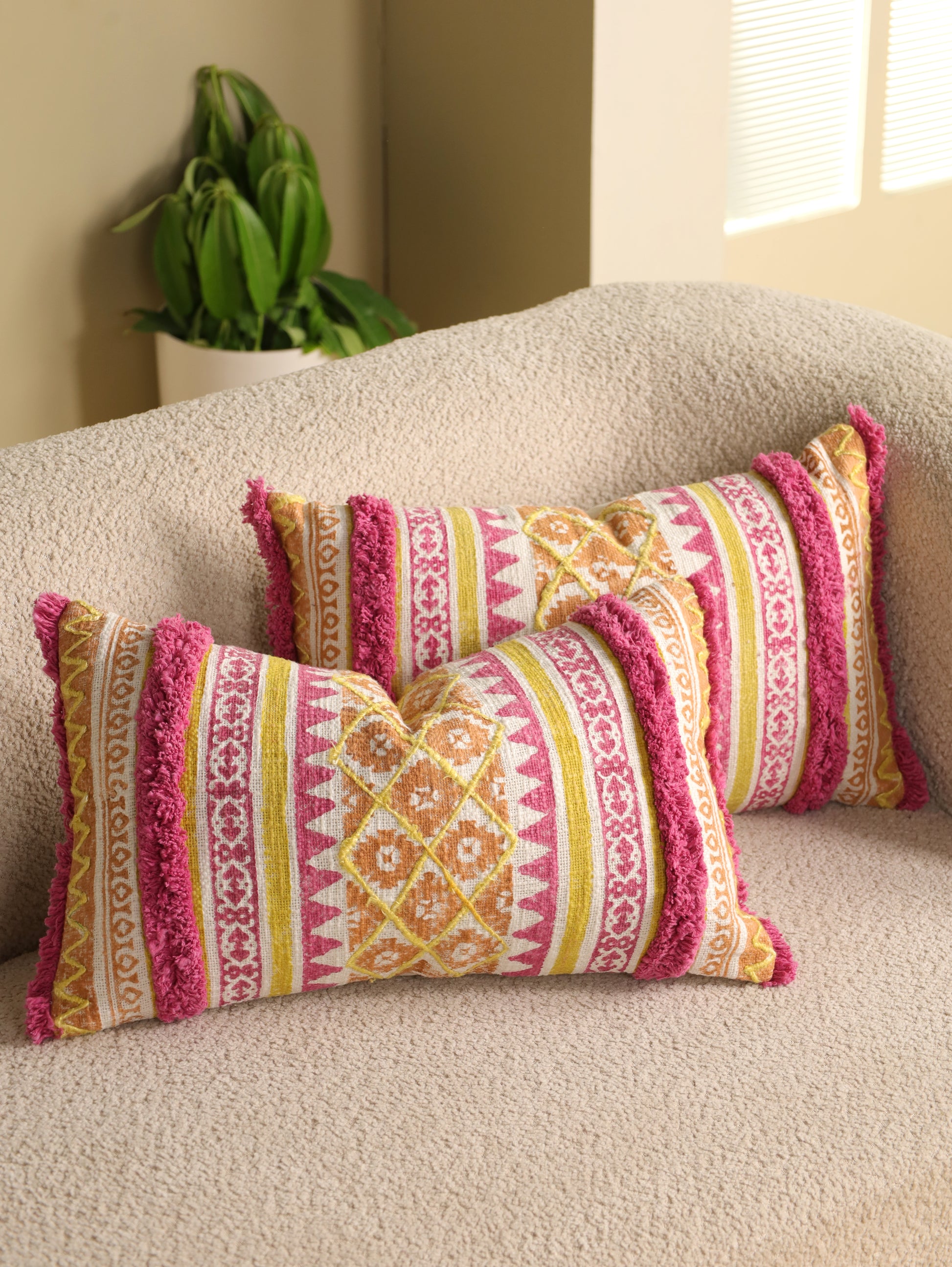 Enhance your interior with the Pink & Yellow Boho Hand Block Printed & Embroidered Cushion Cover, a finely crafted piece showcasing traditional hand block printing paired with intricate embroidery. This cushion cover blends vivid colors and textured patterns to bring handcrafted elegance to your living space. Constructed from durable fabric, it offers lasting quality and a sophisticated aesthetic ideal for sofas, beds, or lounge chairs.