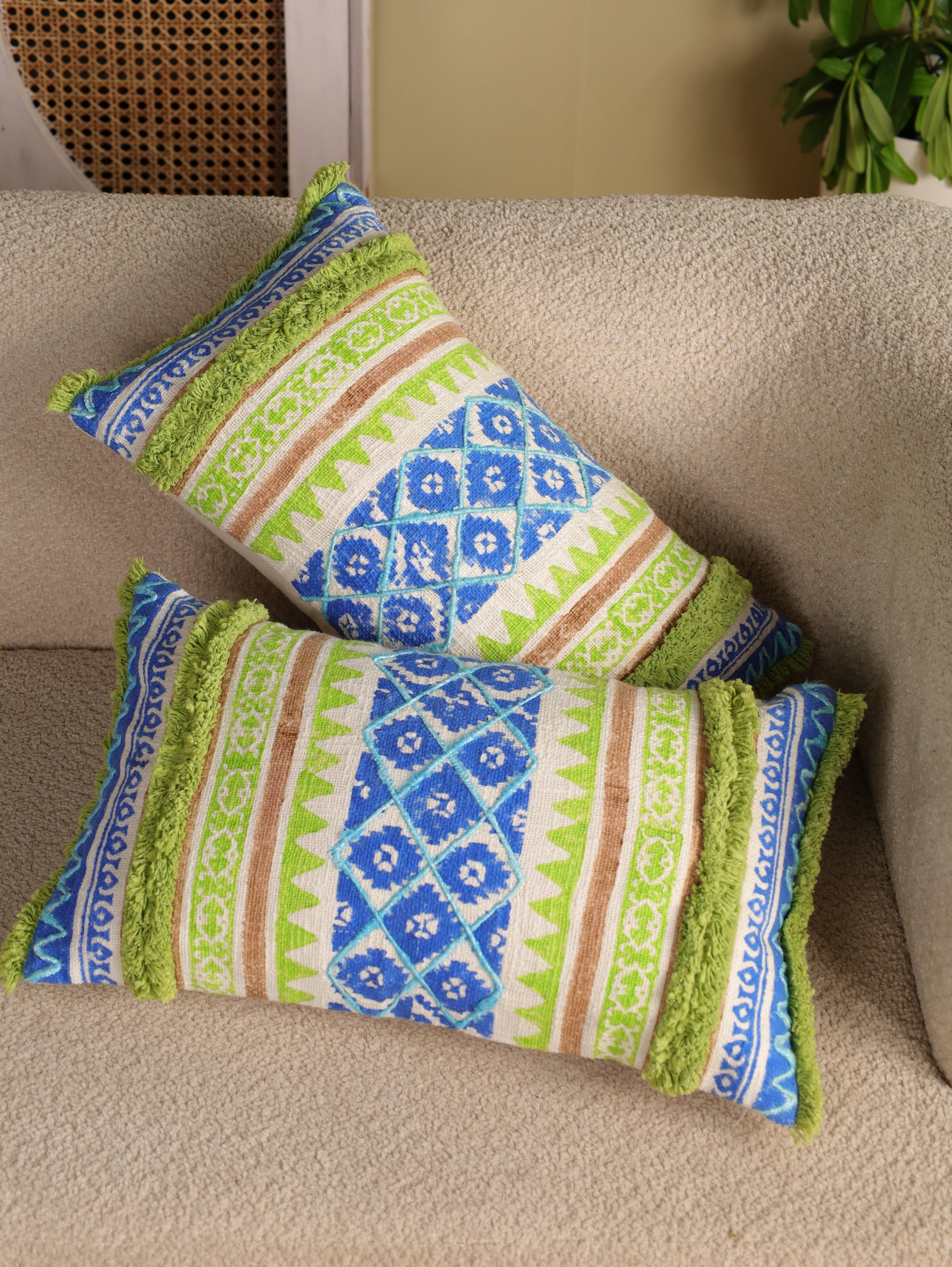 Blue & Green Boho Hand Block Printed & Embroidered Cushion Cover