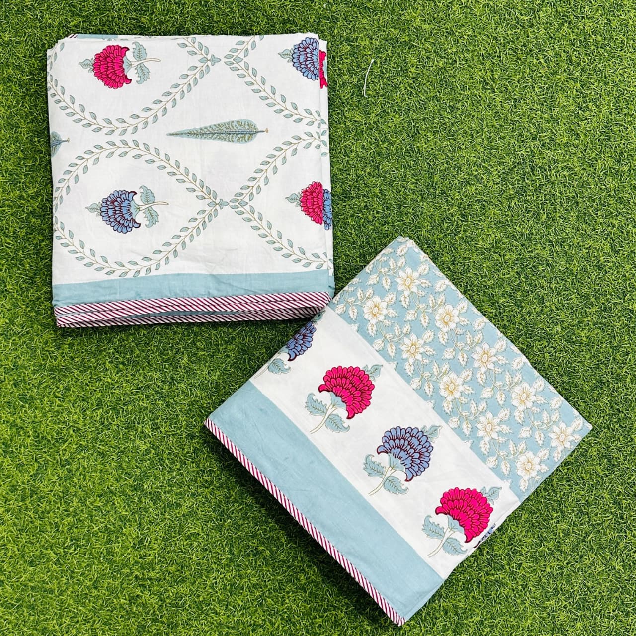 Elevate your bedding with this authentic Jaipuri dohar set, featuring a striking white and blue floral print that brings traditional Rajasthani craftsmanship to your bedroom. Each set includes two reversible dohars, offering versatile styling options for single beds. The lightweight, breathable construction makes these perfect for year-round comfort, while the intricate floral design adds an artistic touch to your décor. Crafted with attention to detail, these dohars combine functionality with timeless aesthetic appeal, making them an ideal choice for those who appreciate handcrafted textiles and cultural heritage.